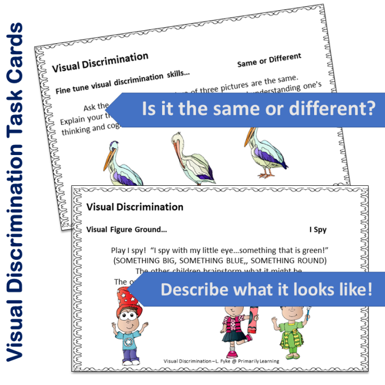 Visual Discrimination “is a general term for visual skills that require the ability to detect specific features of an object, to recognize it, to match, or duplicate it, and to categorize it.” (The FREE Dictionary by Farlex)